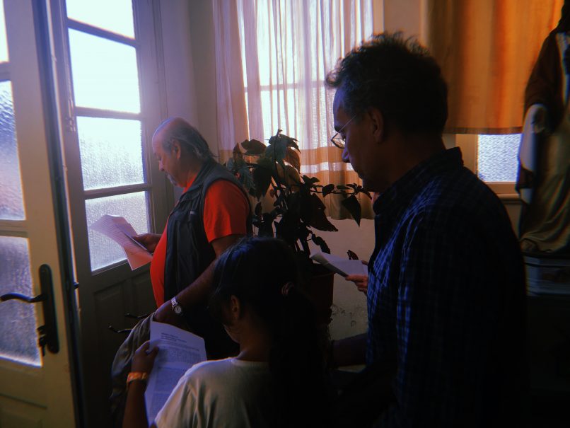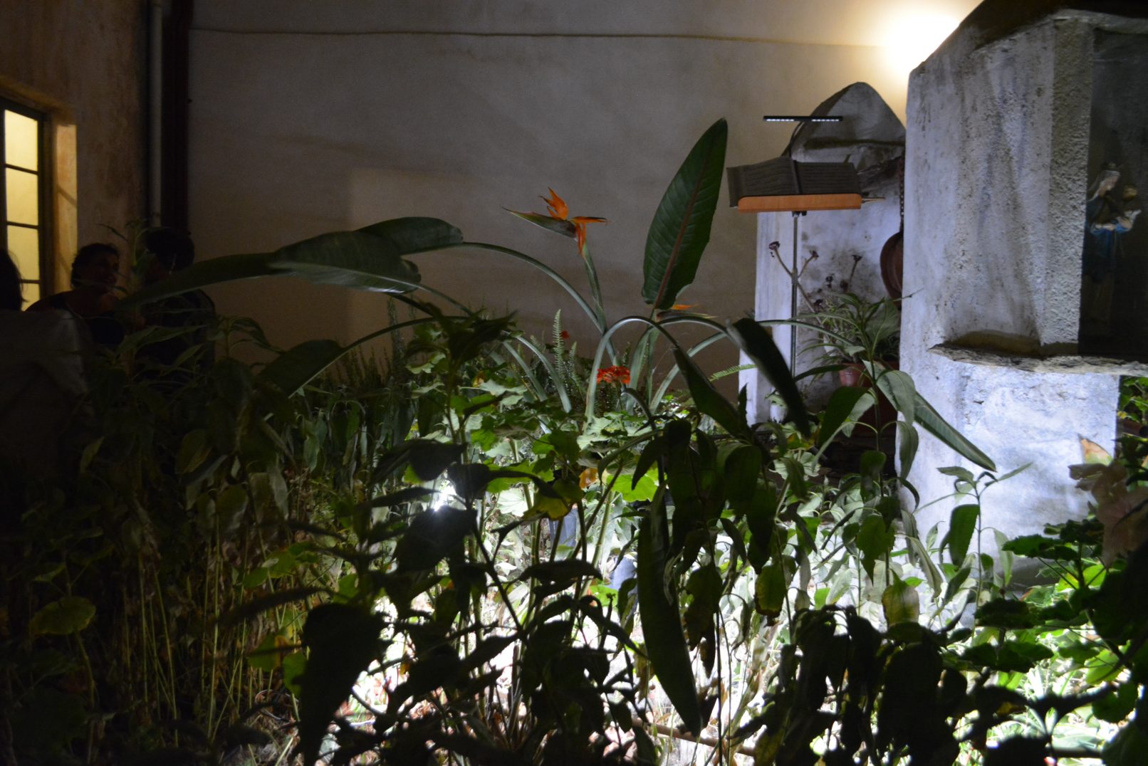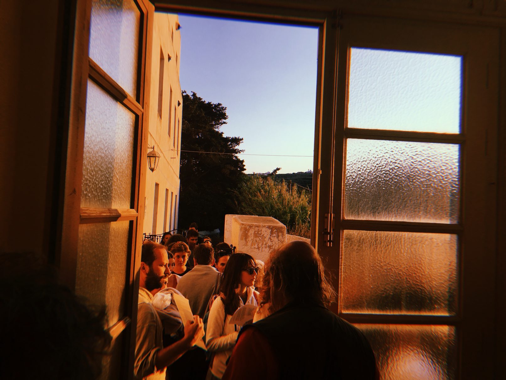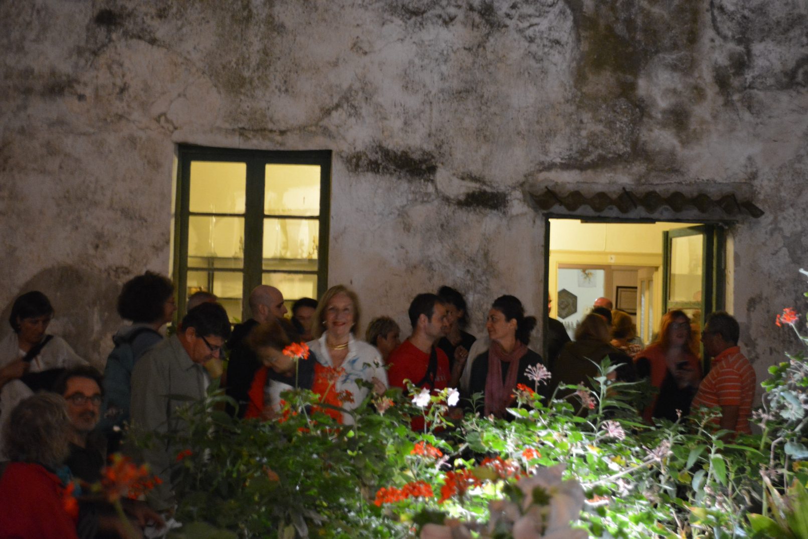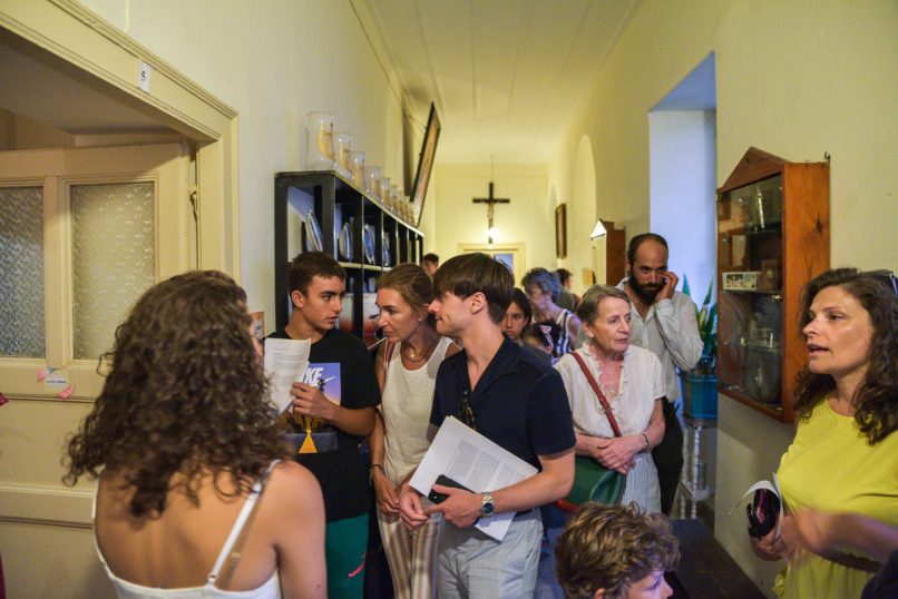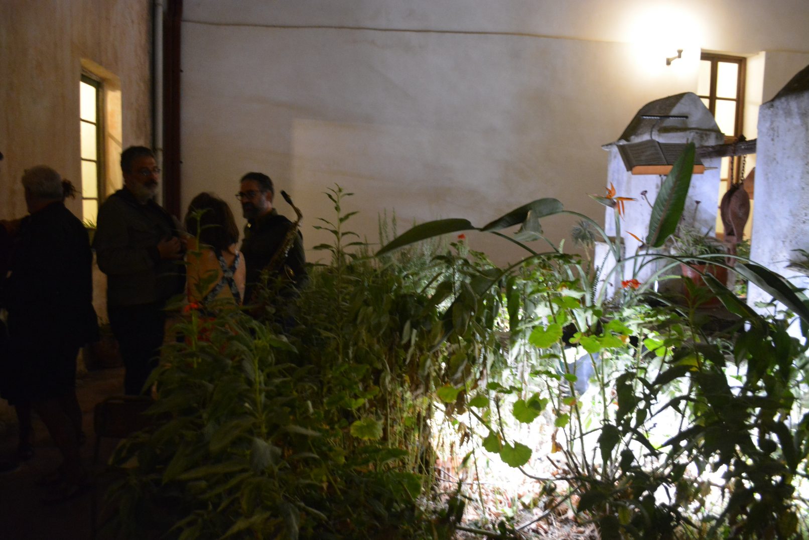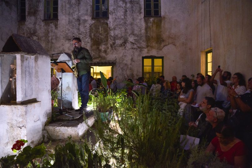 Από τις 19:45 οι επισκέπτες άρχισαν να εισέρχονται στον εκκλησιαστικό χώρο , από όπου ξεκίνησε μια σύντομη ξενάγηση στις κοινόχρηστες αίθουσες της Μονής. Οι επισκέπτες περιηγήθηκαν σε αυτούς τους χώρους και στη συνέχεια συγκεντρώθηκαν στο άβατο της τραπεζαρίας των Μοναχών, όπου ακούστηκαν αποσπάσματα ποιημάτων της Μέλπως Αξιώτη. Από εκεί οδηγήθηκαν στο αίθριο, γύρω από το κεντρικό πηγάδι όπου οι μουσικοί στεκούμενοι αντικριστά ξεκίνησαν την performance .